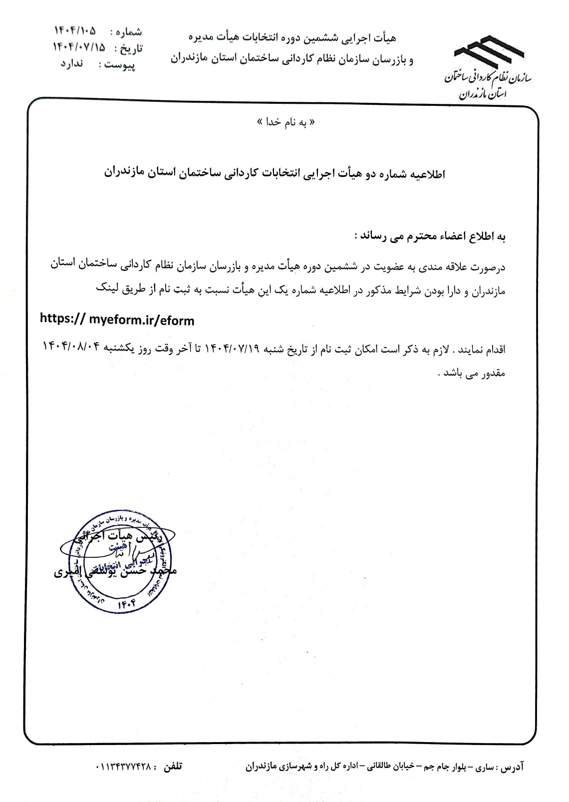 اطلاعیه شماره 2 هیات اجرایی انتخابات کاردانی ساختمان استان مازندران