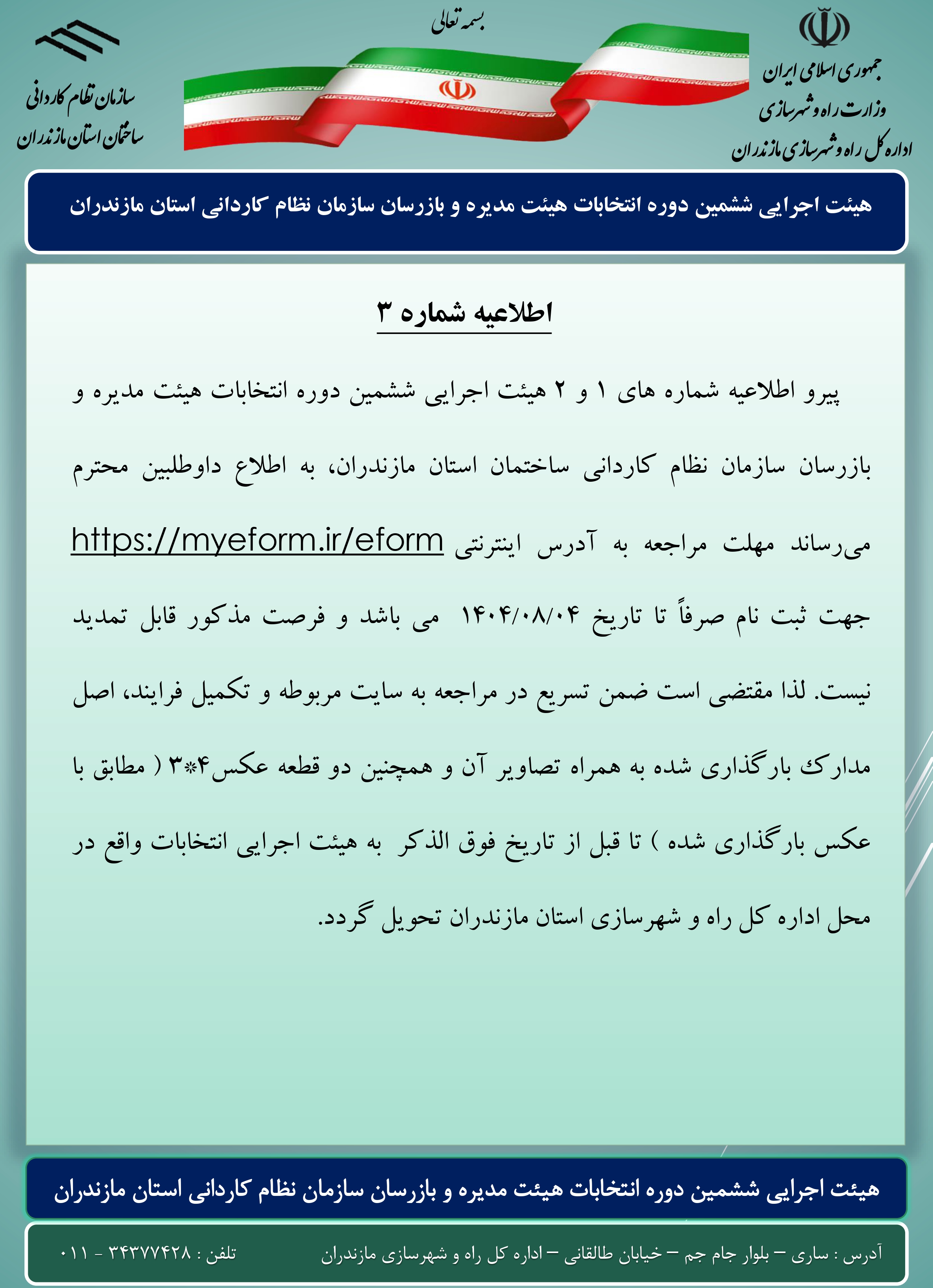 اطلاعیه شماره 3 هیات اجرایی انتخابات کاردانی ساختمان استان مازندران